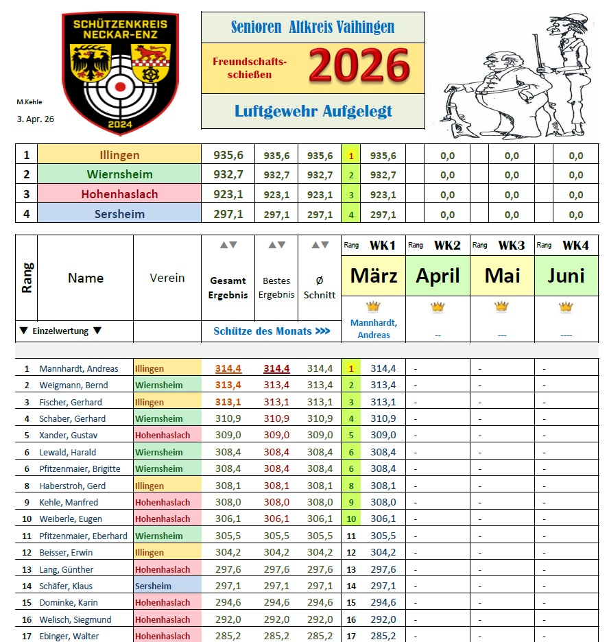 Hier die Ergebnisse der Seniorenrunde Luftgewehr aufgelegt – Stand Ende März 2026